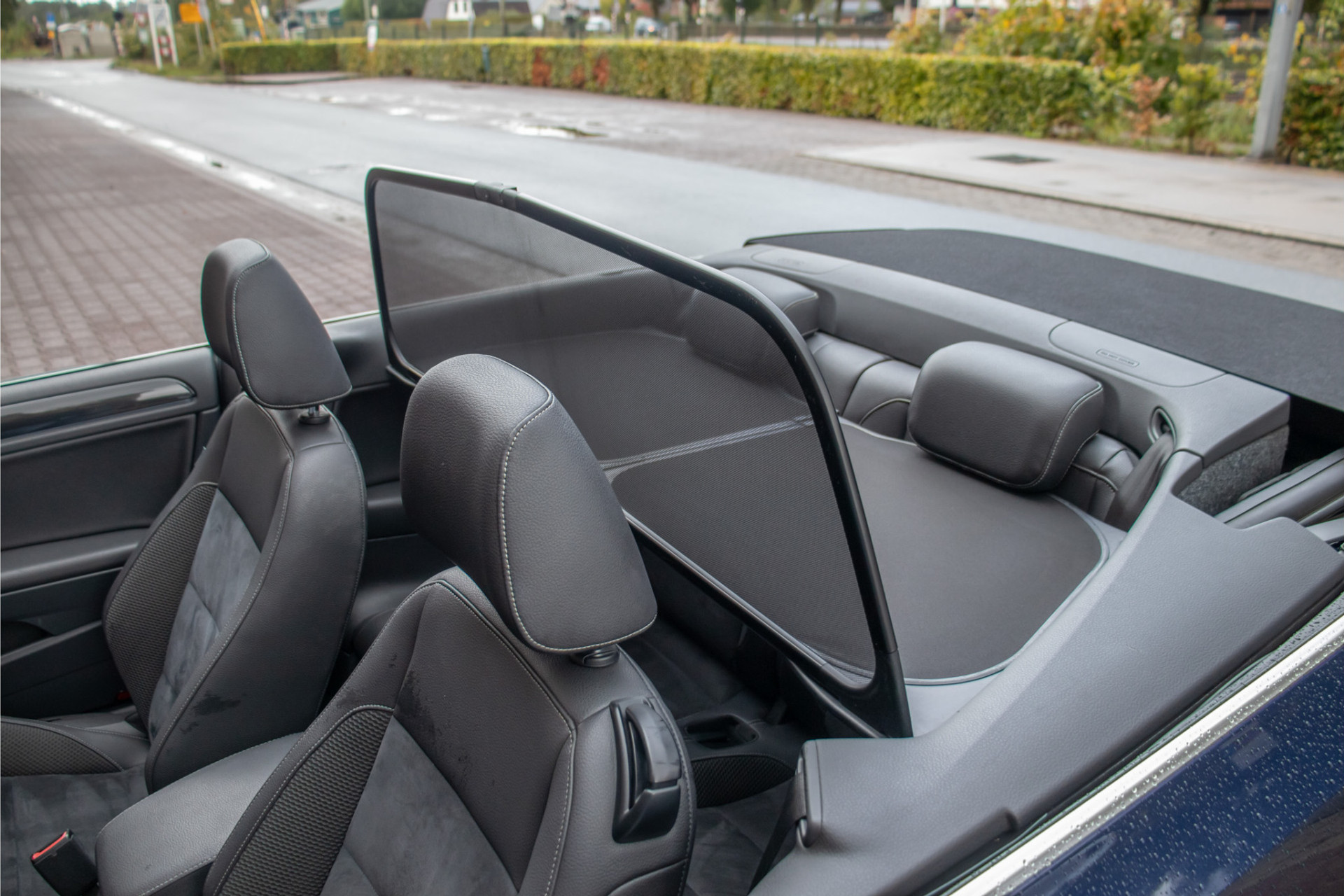 Deze Golf Cabrio is in het fraaie 'Night Blue' in combinatie met 'Catch Up' Titaanzwart bekleding en 'Black Stripe' sierlijsten wel een heel chique verschijning!