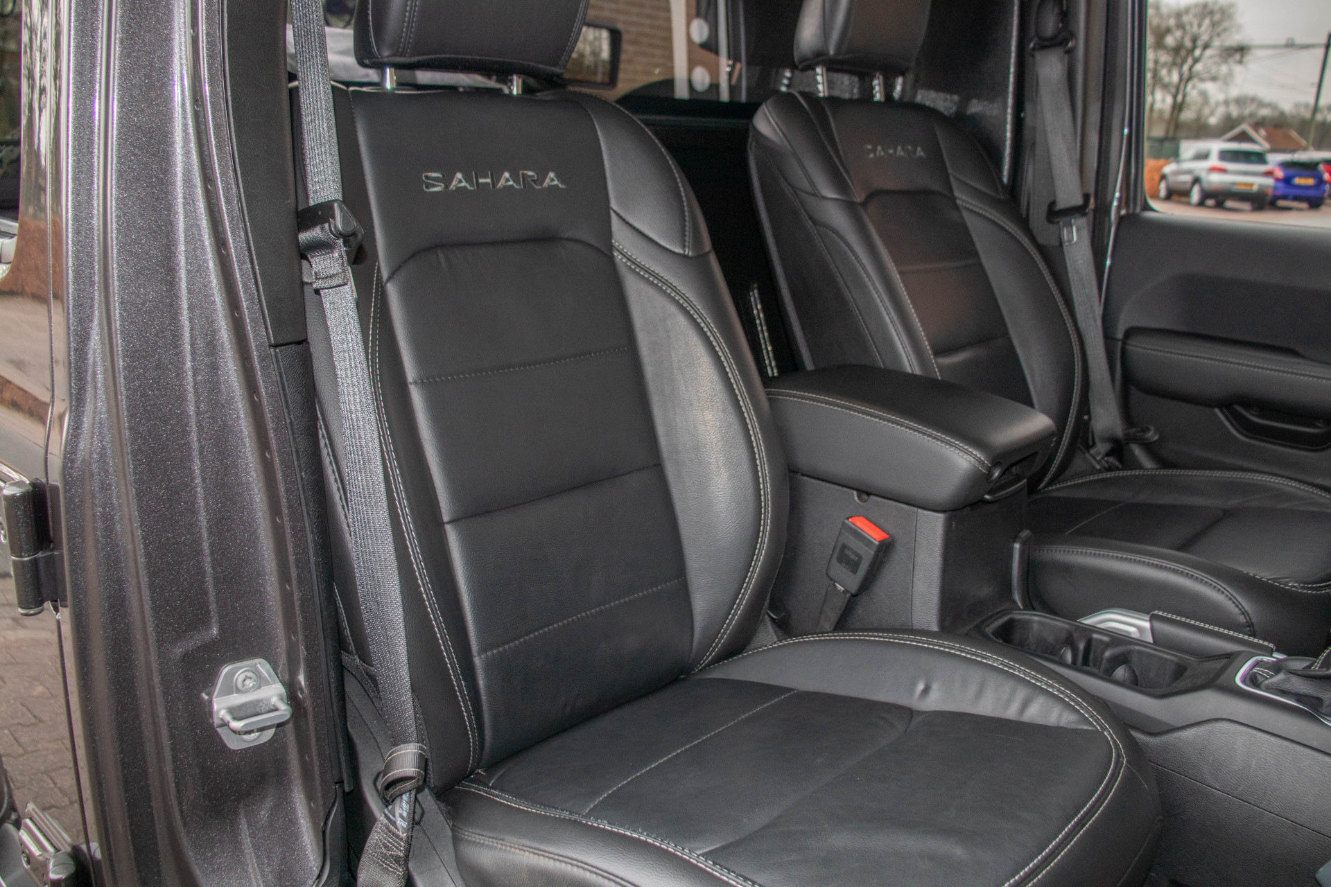 Als Sahara al rijkelijk voorzien van voorzieningen als Uconnect LIVE infotainmentsysteem met 8,4-inch touchscreen, navigatie, Bluetooth en Apple Carplay & Android Auto, ParkView achteruitrijcamera, Parksense parkeerhulp voor/achter en koplampen met Signature LED verlichting.