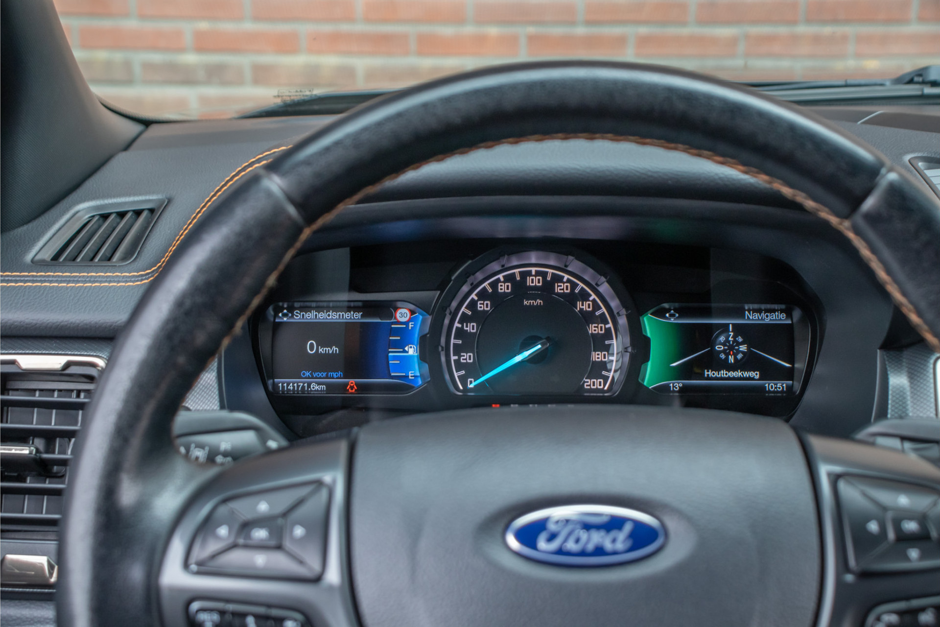 De combinatie van 'Shadow Black' metallic met 'Titanium' exterieurdetails en 'Trak Orange/Ebony' half lederen bekleding maken van deze pick-up een eigenzinnig geheel.