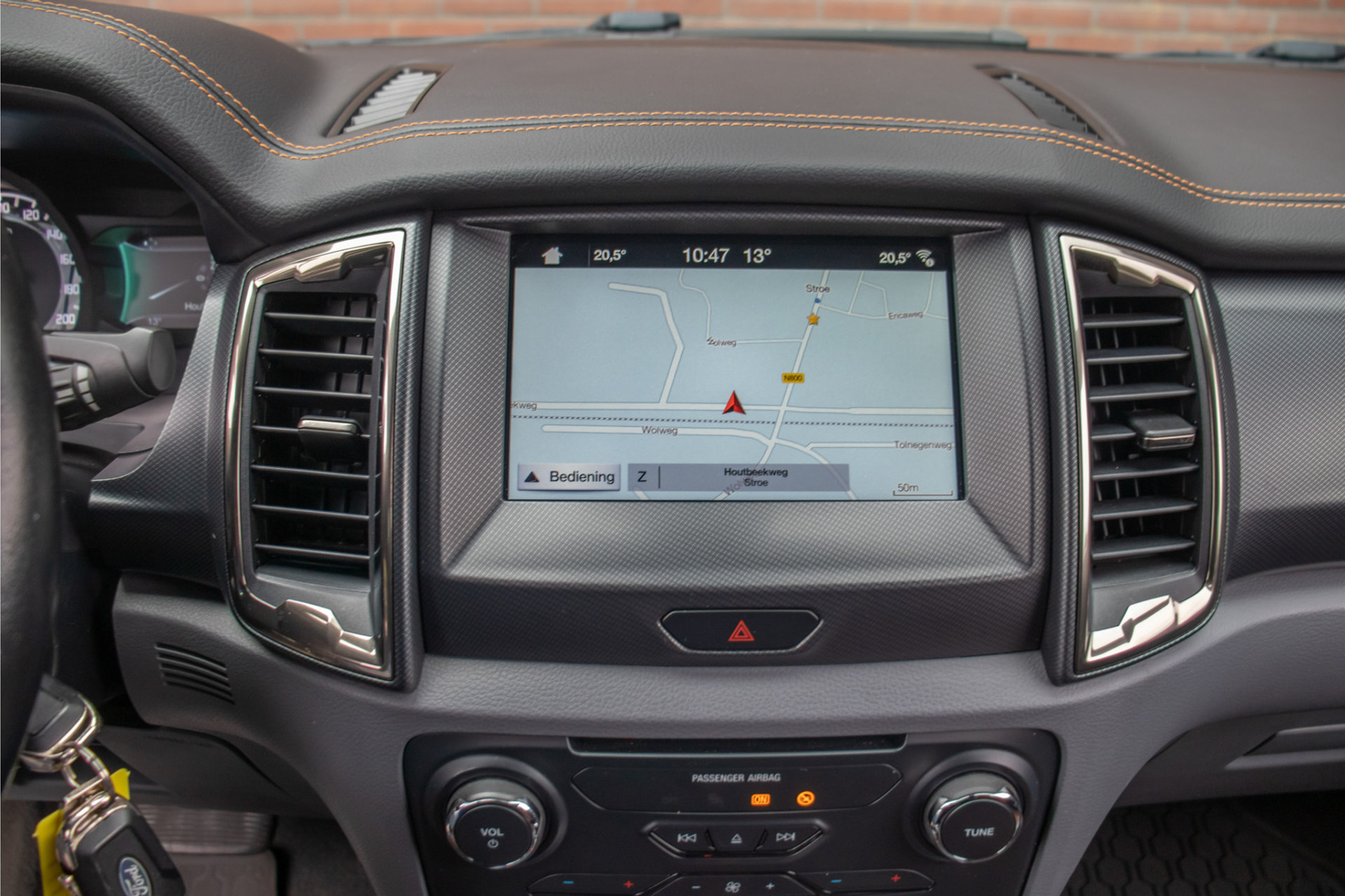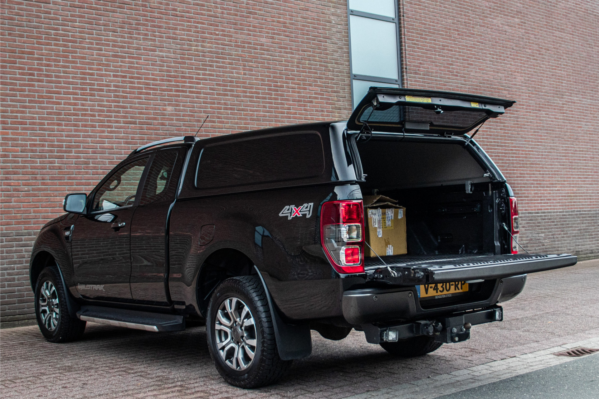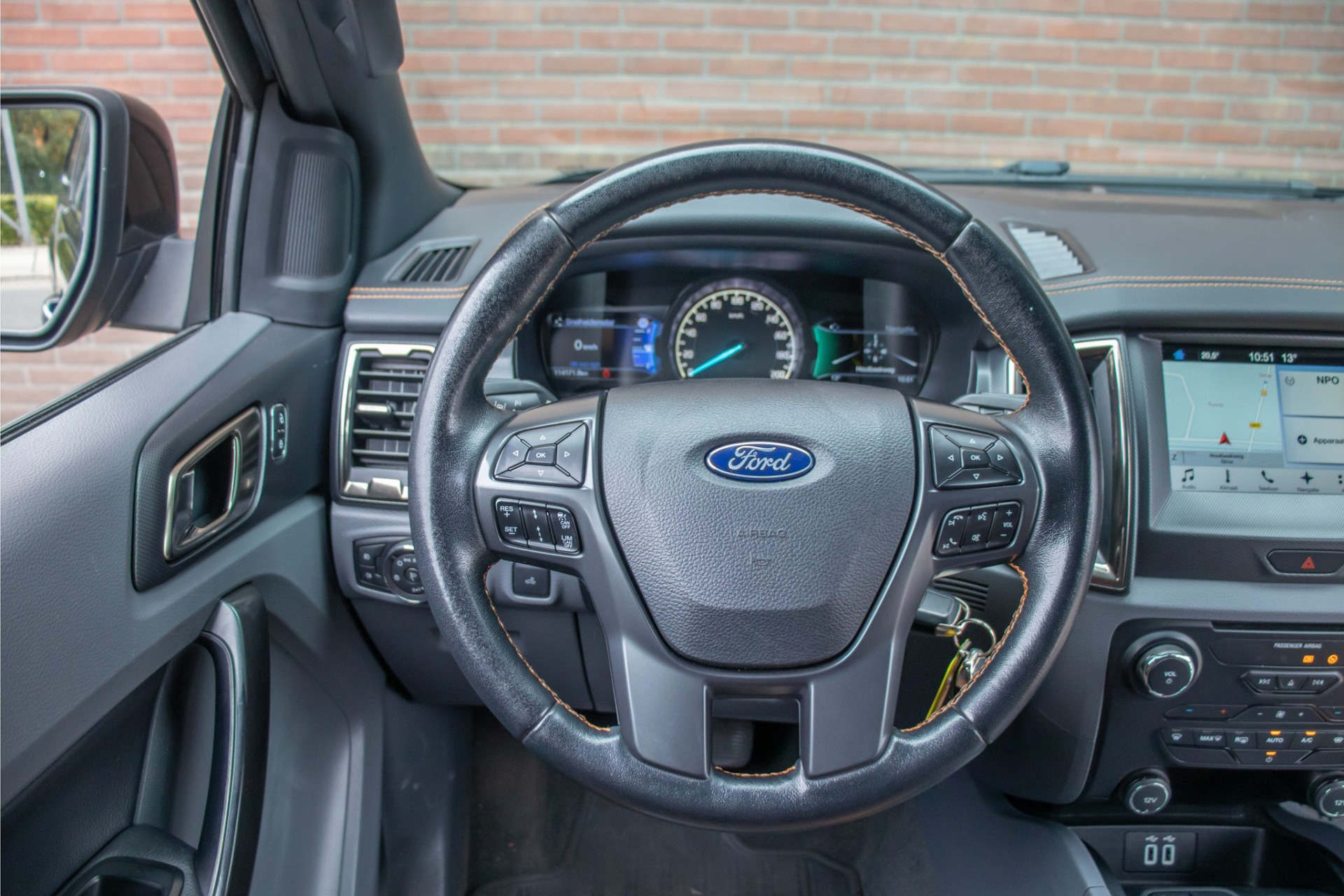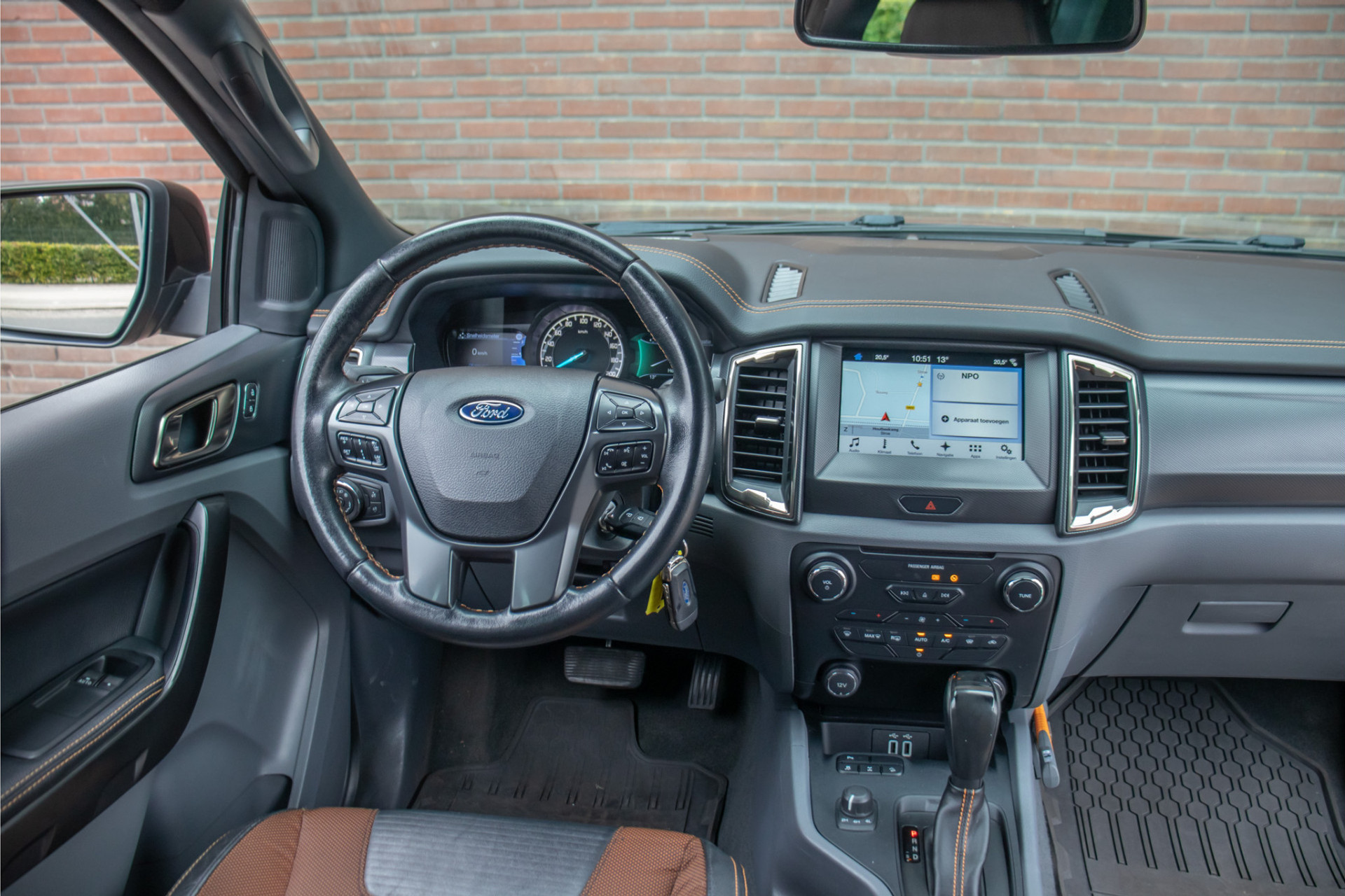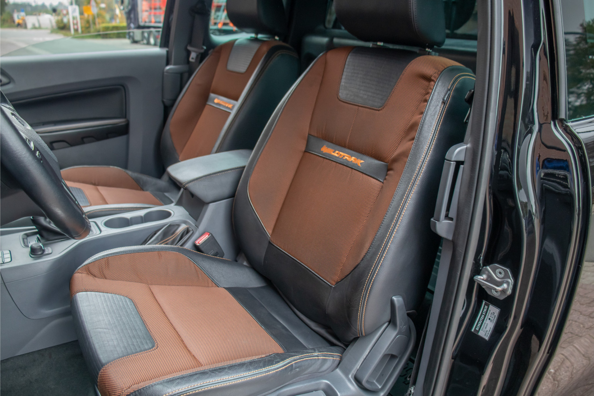 De combinatie van 'Shadow Black' metallic met 'Titanium' exterieurdetails en 'Trak Orange/Ebony' half lederen bekleding maken van deze pick-up een eigenzinnig geheel.
