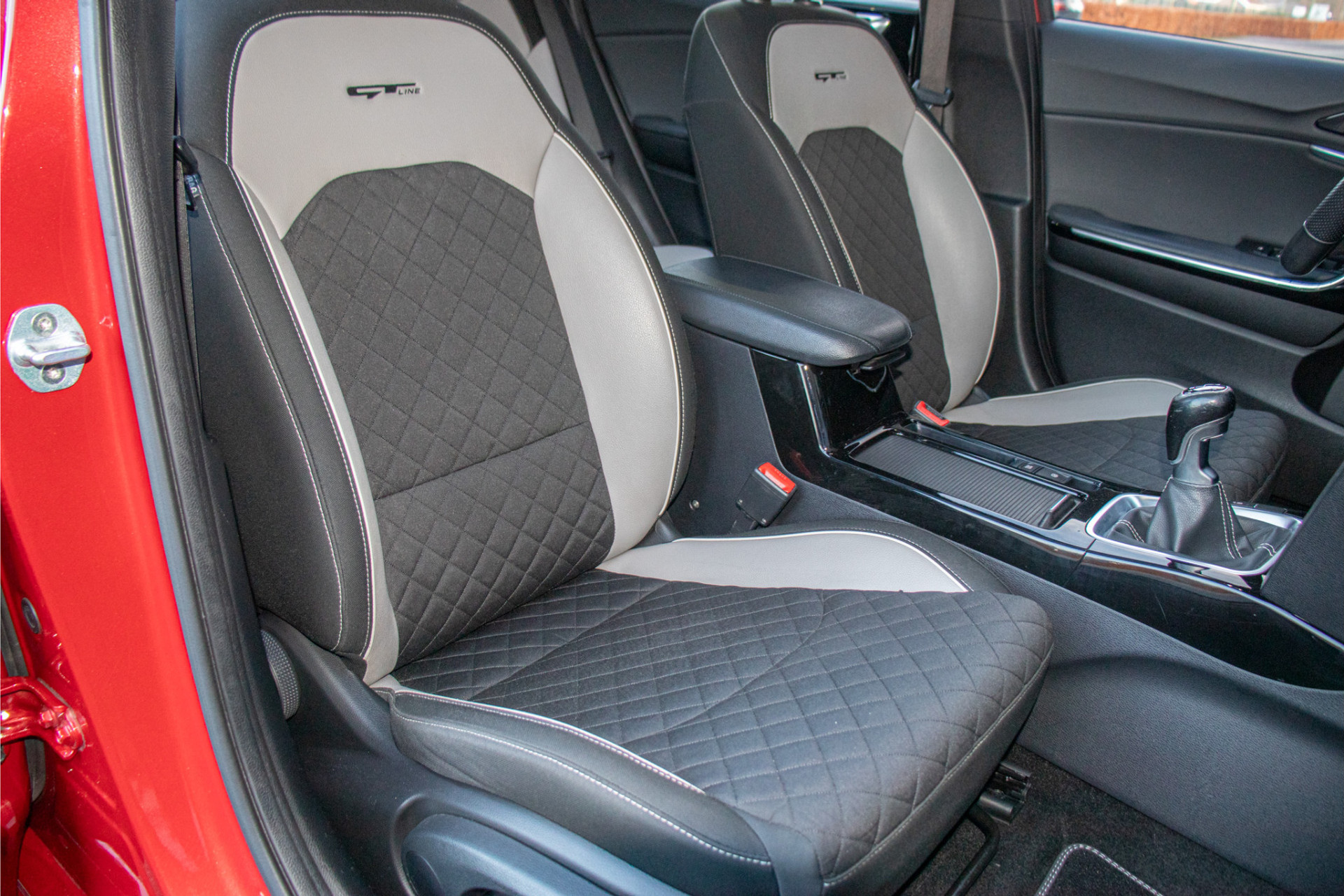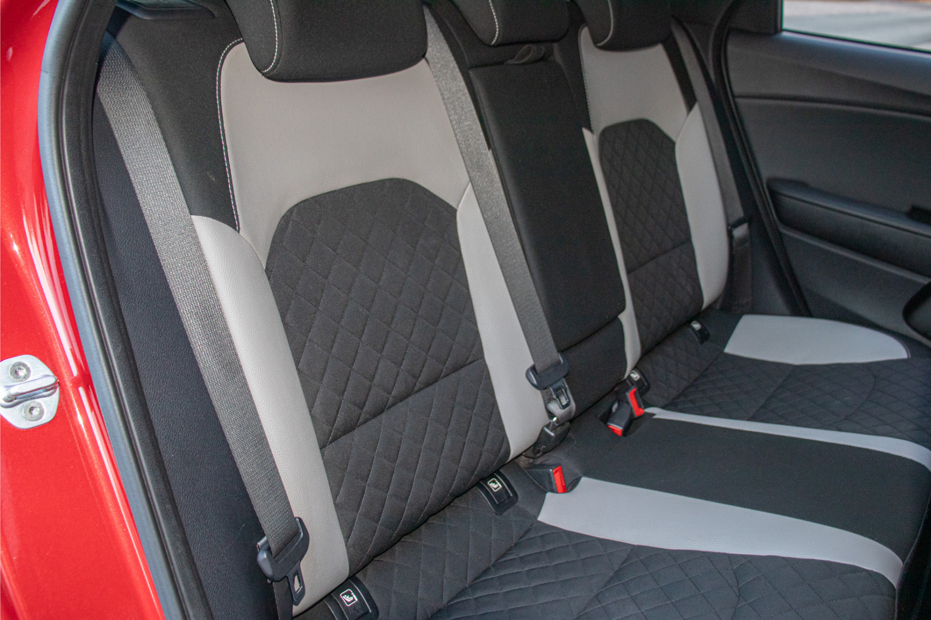 In het interieur wordt het sportieve thema doorgetrokken met de sportstoelen met Suède/kunstlederen bekleding met zilveren details, lederen D-shaped stuurwiel en hemelbekleding in zwart.