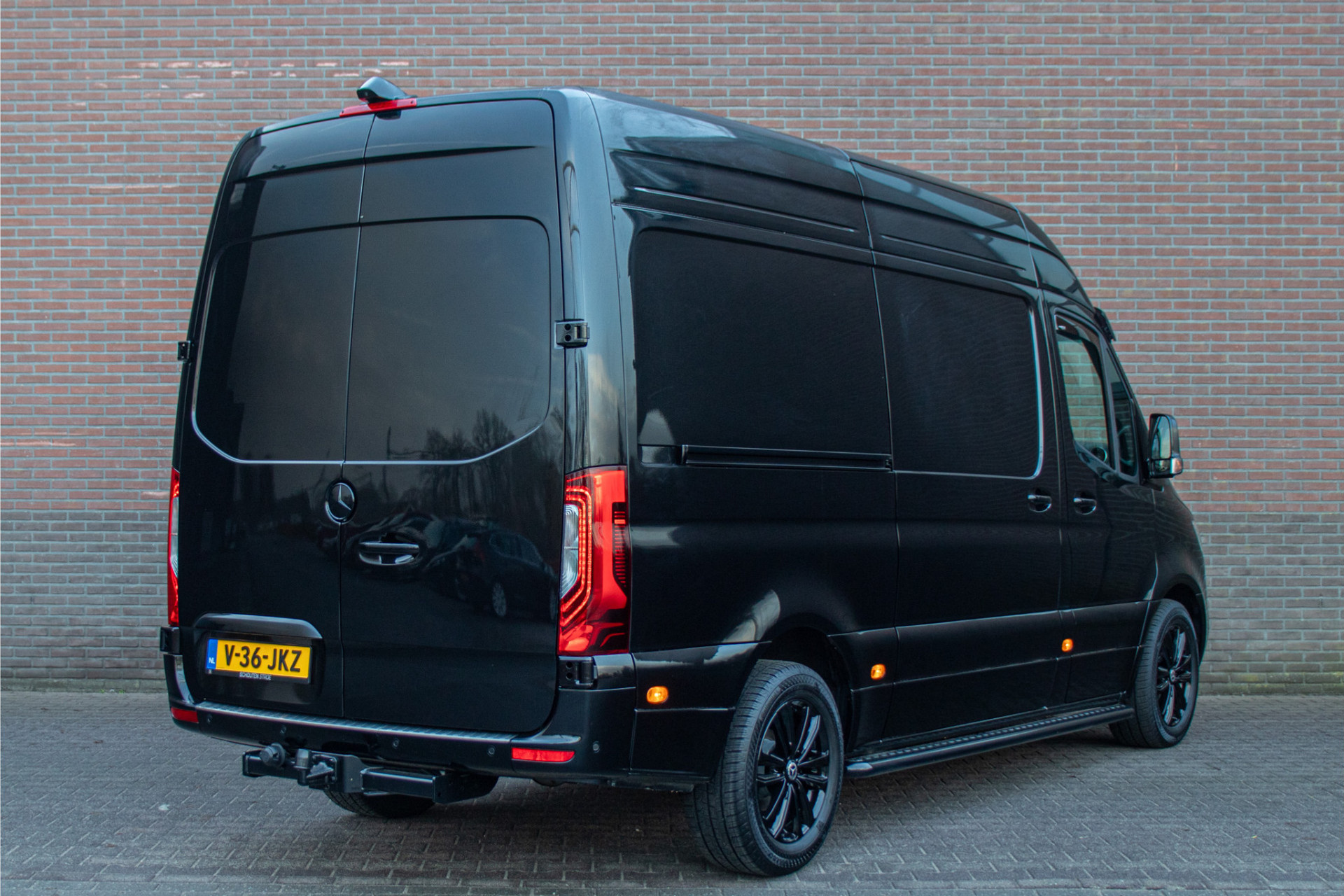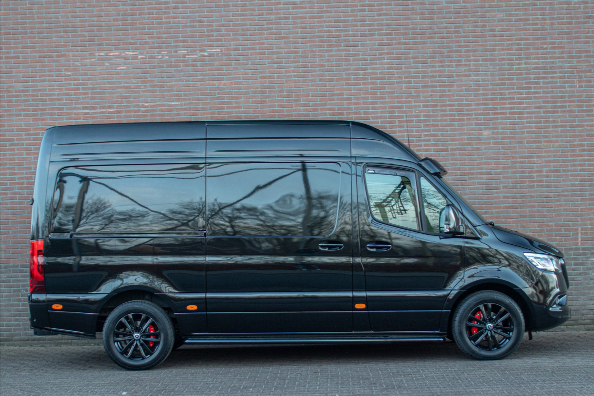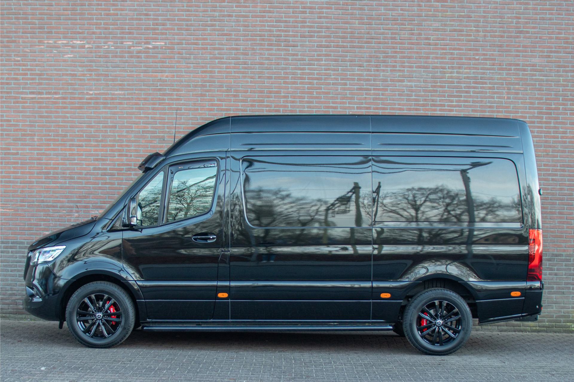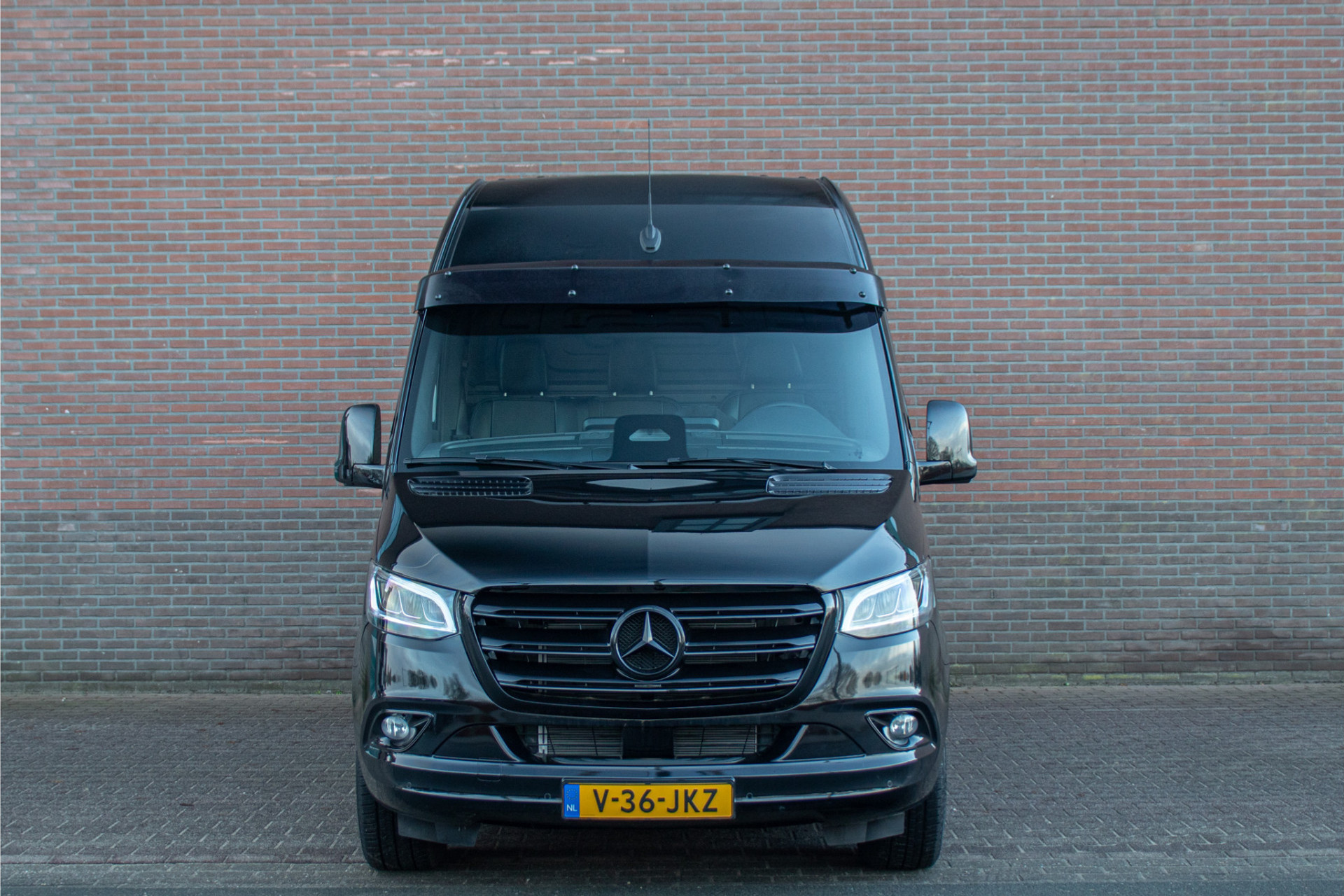 Dit betreft een gloednieuwe Sprinter L2H2 met de krachtige 191pk motor. Deze heeft wel een heel unieke en stoere uitstraling met de zonneklep, treeplanken, zwarte logo's en zijmarkeringslichten in combinatie met 'Obsidiaanzwart' metaallak en zwart gespoten Borbet wielen.