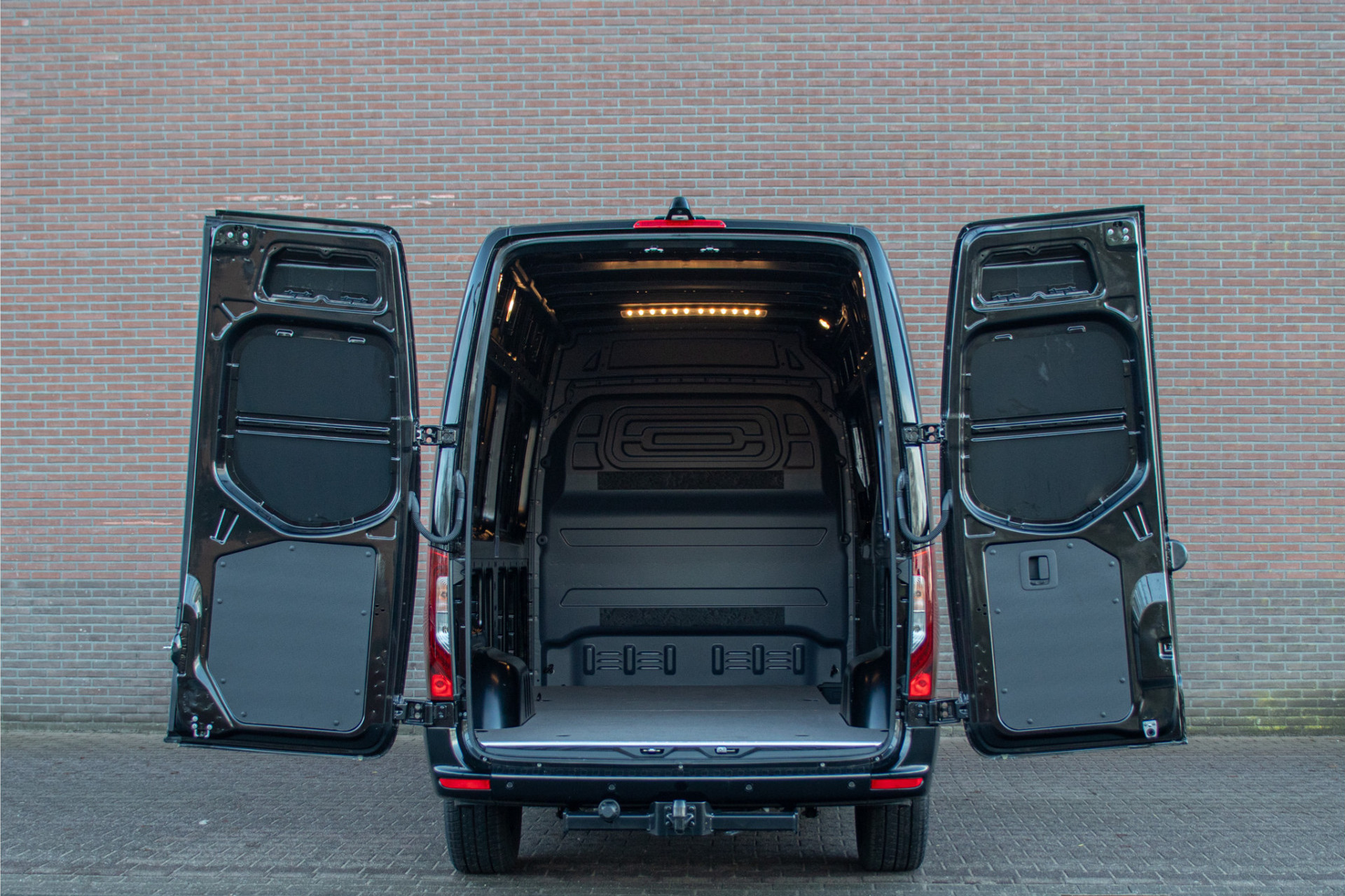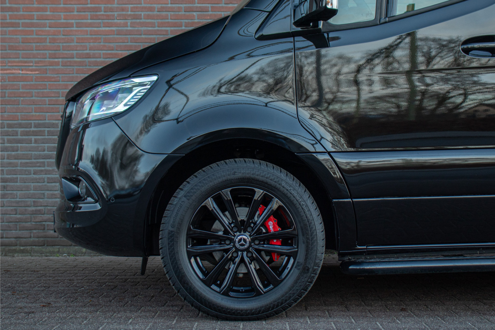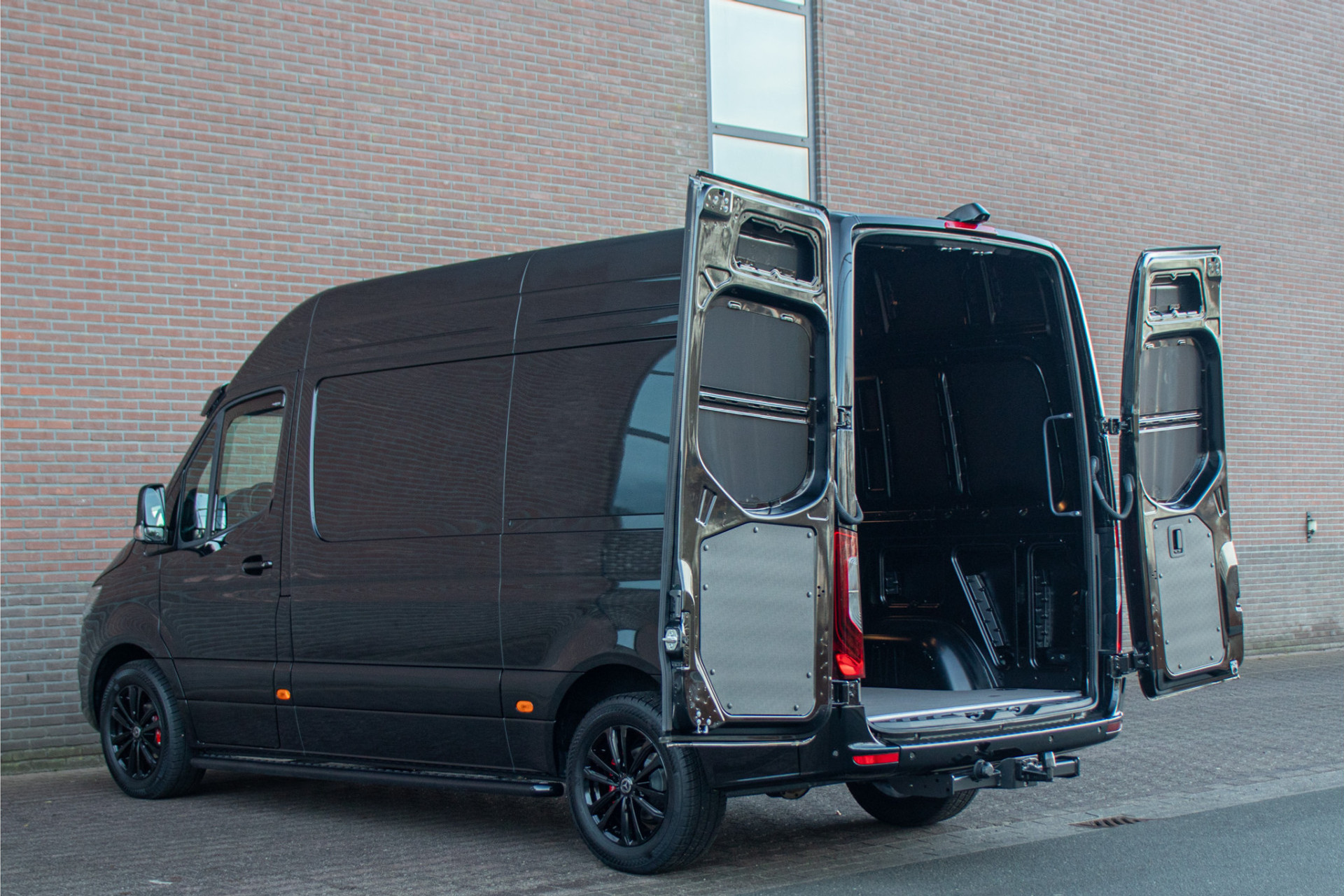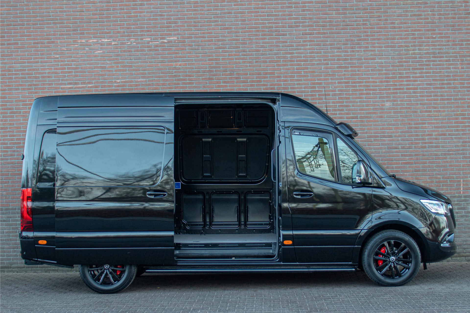 Dit betreft een gloednieuwe Sprinter L2H2 met de krachtige 191pk motor. Deze heeft wel een heel unieke en stoere uitstraling met de zonneklep, treeplanken, zwarte logo's en zijmarkeringslichten in combinatie met 'Obsidiaanzwart' metaallak en zwart gespoten Borbet wielen.
