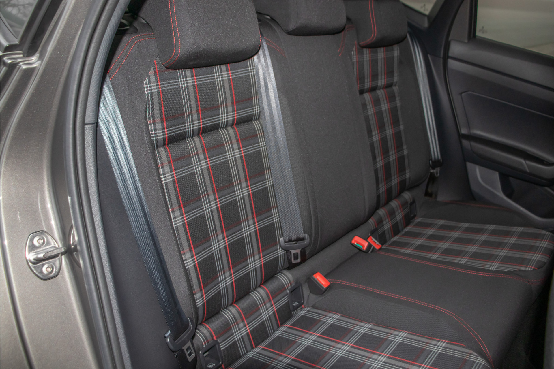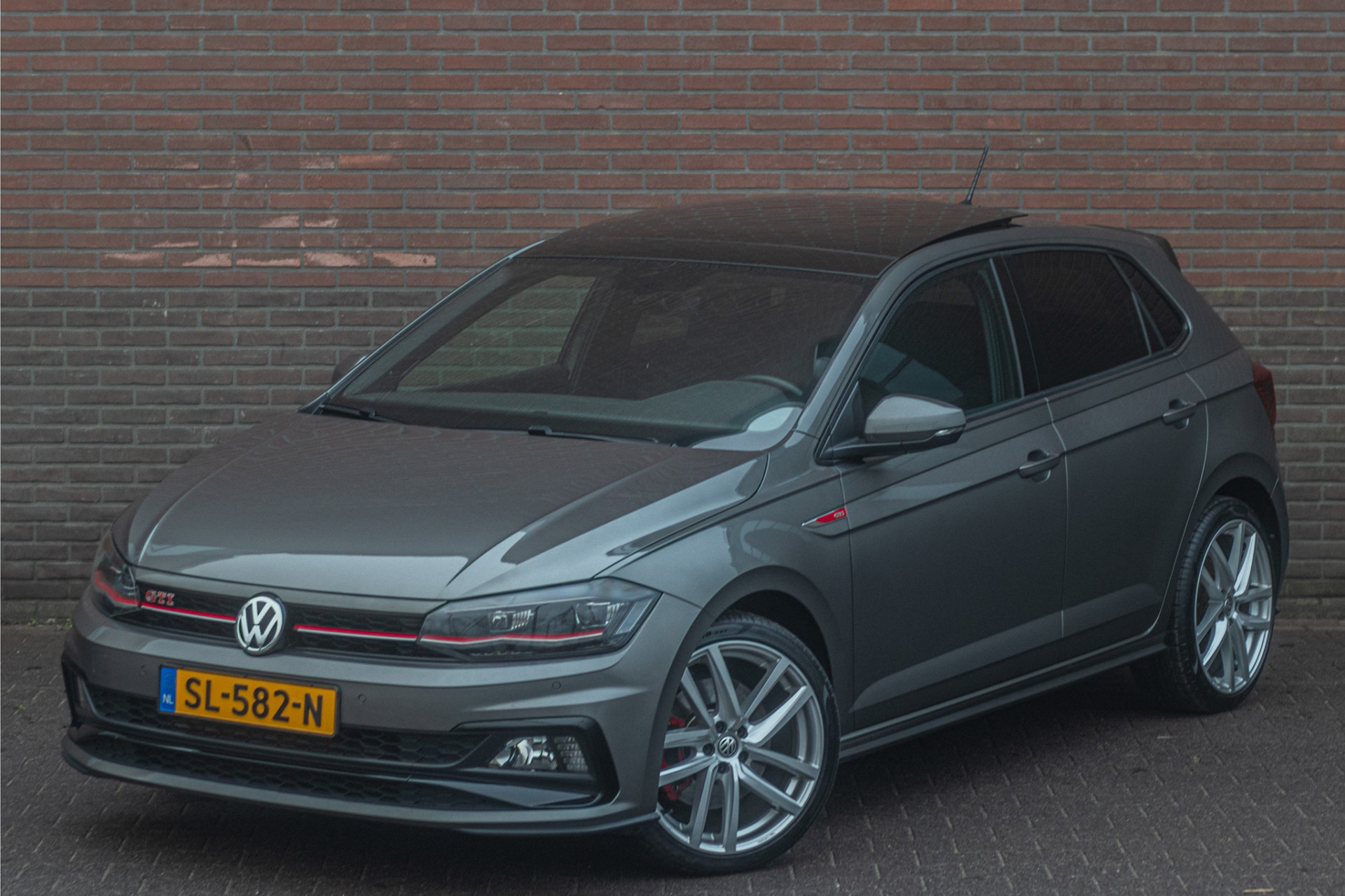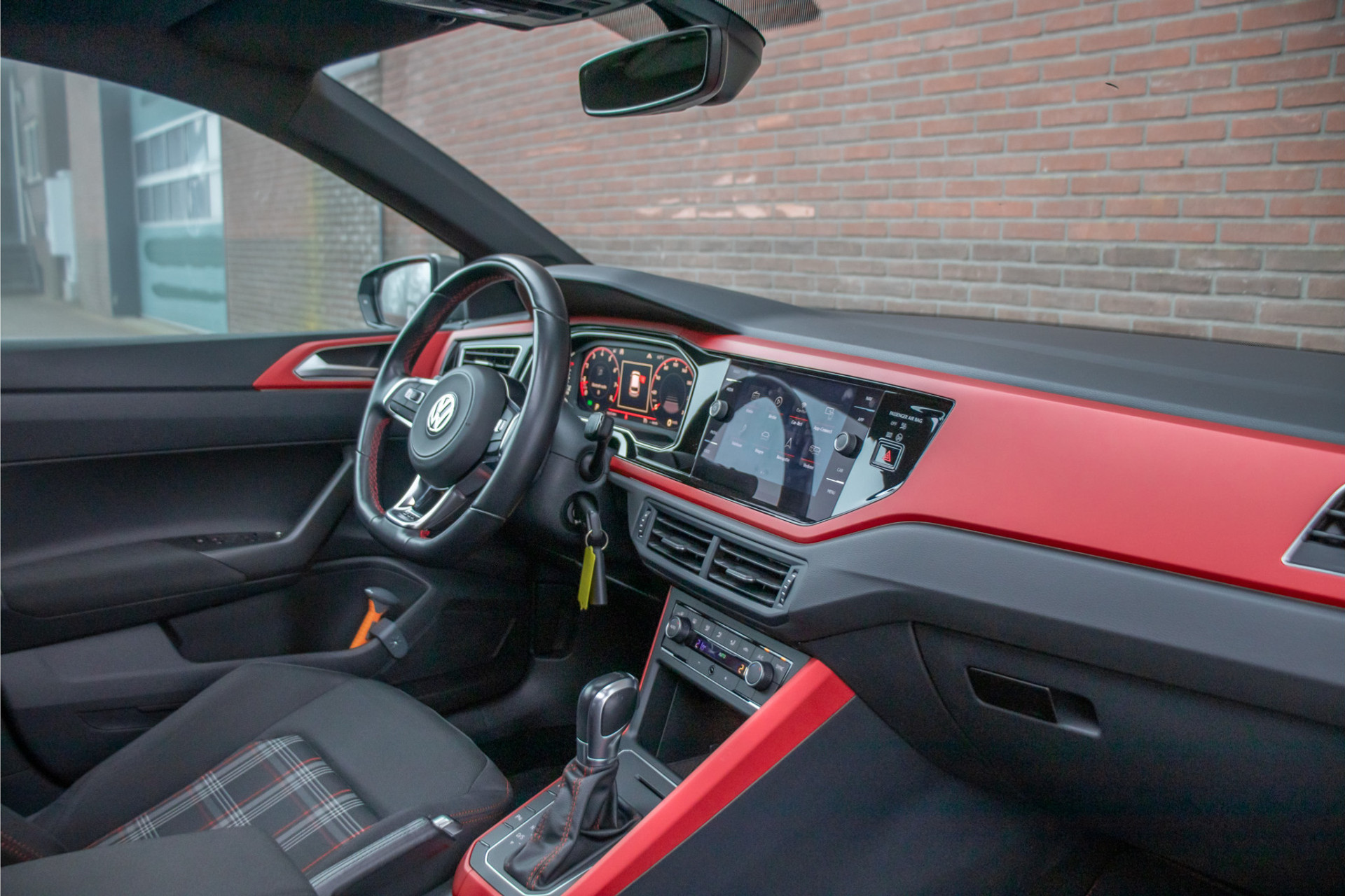 De combinatie van 'Limestone Grey' metallic lak, 'Clark' stoffen bekleding en 'Velvet Red' mat decorinleg geeft deze Polo precies de juiste klassieke uitstraling met een moderne twist.