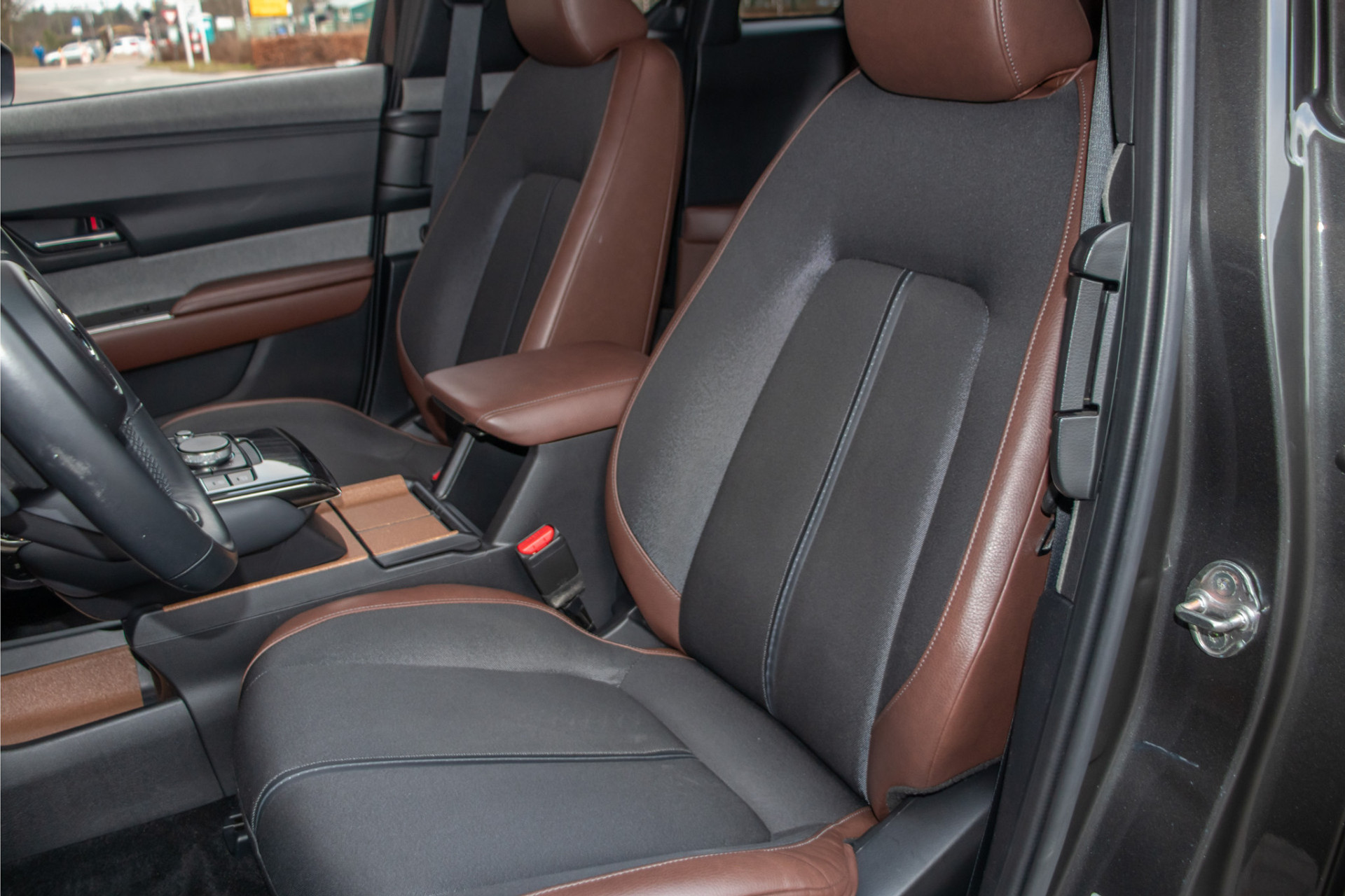 De combinatie van 'Machine Grey' metallic lak, 'Grey Metallic' wielen en Terracotta kunstlederen interieur met zwarte suéde zitting geven de Mazda een chique uitstraling.
