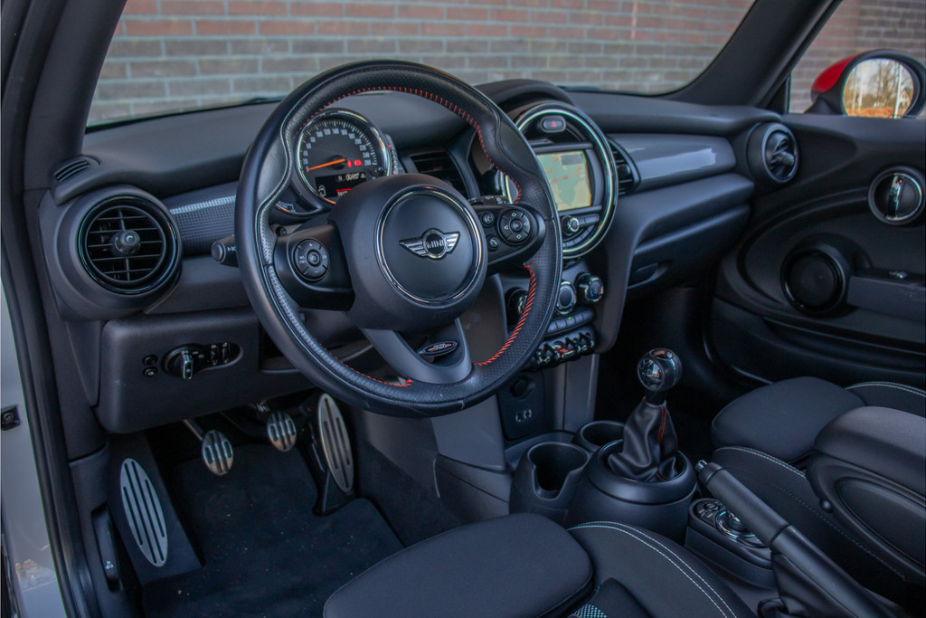 Fraai is ook zeker de combinatie van het JCW pakket met 'White Silver' metallic lak en interieurstijl Piano Black met 'Hazy Grey' sierlijsten. Het optionele John Cooper Works pakket bestaat uit: - JCW sportstoelen met bekleding Dinamica/stof-combinatie 'Carbon Black' - JCW met leer bekleed stuurwiel met rood stiksel - Performance Control - Hemelbekleding in antraciet uitgevoerd - JCW aerodynamica kit - JCW achterspoiler - 17" velgen 'Cosmos Spoke' zwart