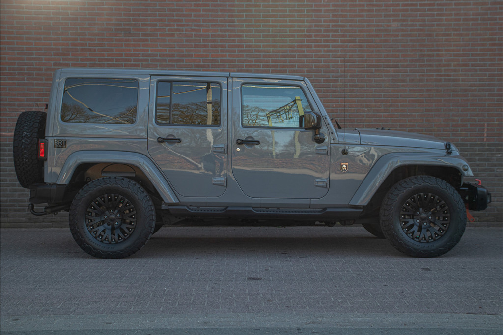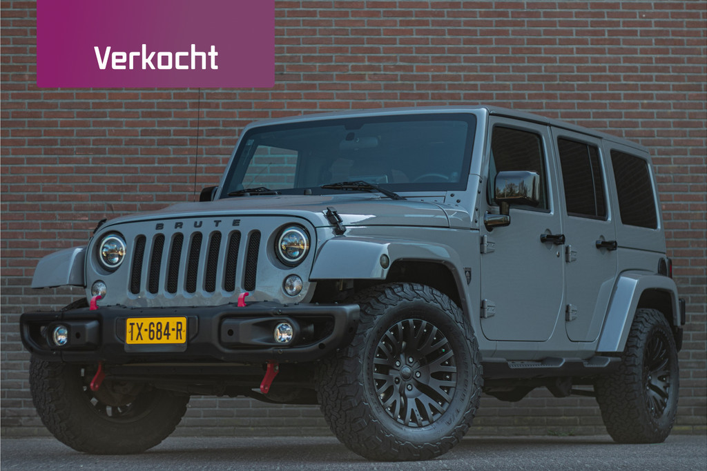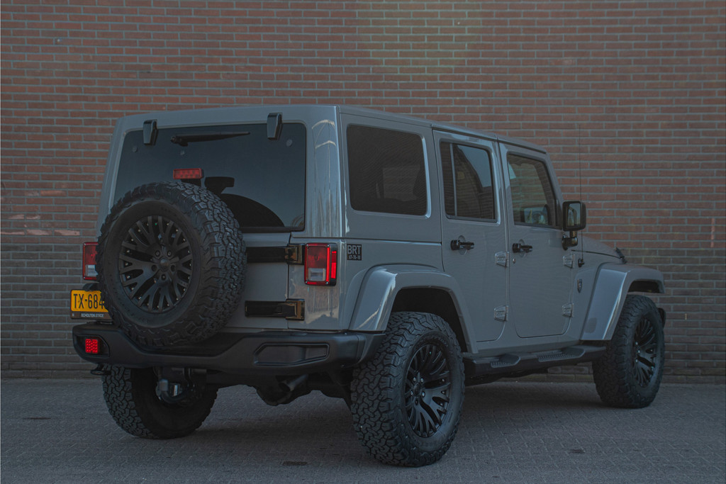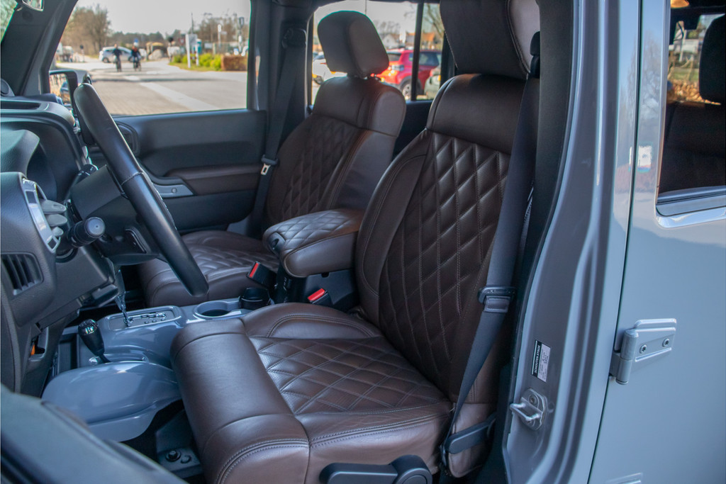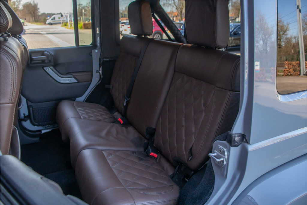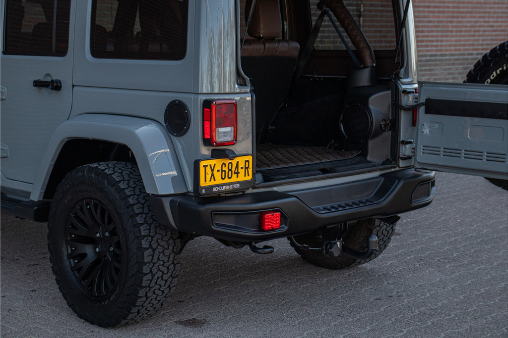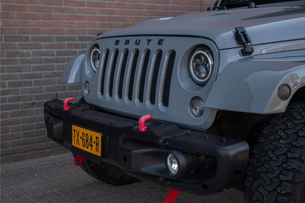Zo zijn bij deze Unlimited de volgende custom aanpassingen door Brute gedaan: - 'Nardo Grey' speciale kleur (Audi) - Grille, buitenspiegelkappen, handgrepen, logo's en airvents motorkap in hoogglans zwart uitgevoerd - LED verlichting - 17 inch Kahn lichtmetaal - 'Dark Brown' lederen bekleding met diamond stitching - Lederen roll-bar bekleding - Hardtop interieur in 'Dark Brown' gespoten - Namen in hoofdsteunen verwerkt - Luxe mattenset inclusief kofferbakmat Daarnaast is deze Jeep ook nog eens extra voorzien van stoelverwarming vóór, Alpine multimediasysteem met Apple Carplay en DAB+, achteruitrijcamera en een trekhaak.