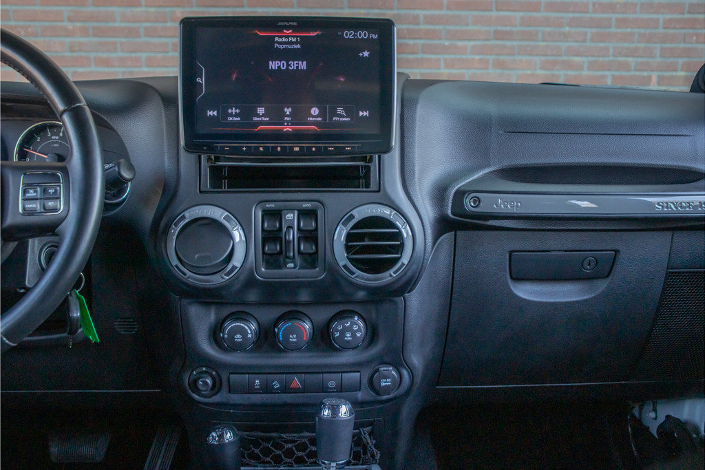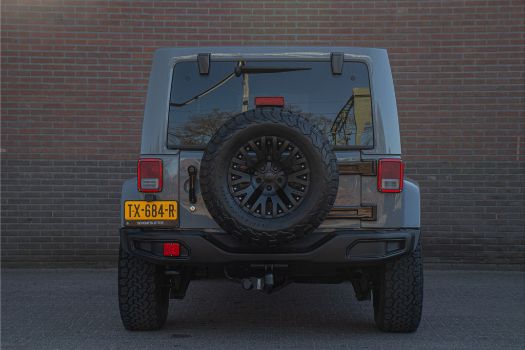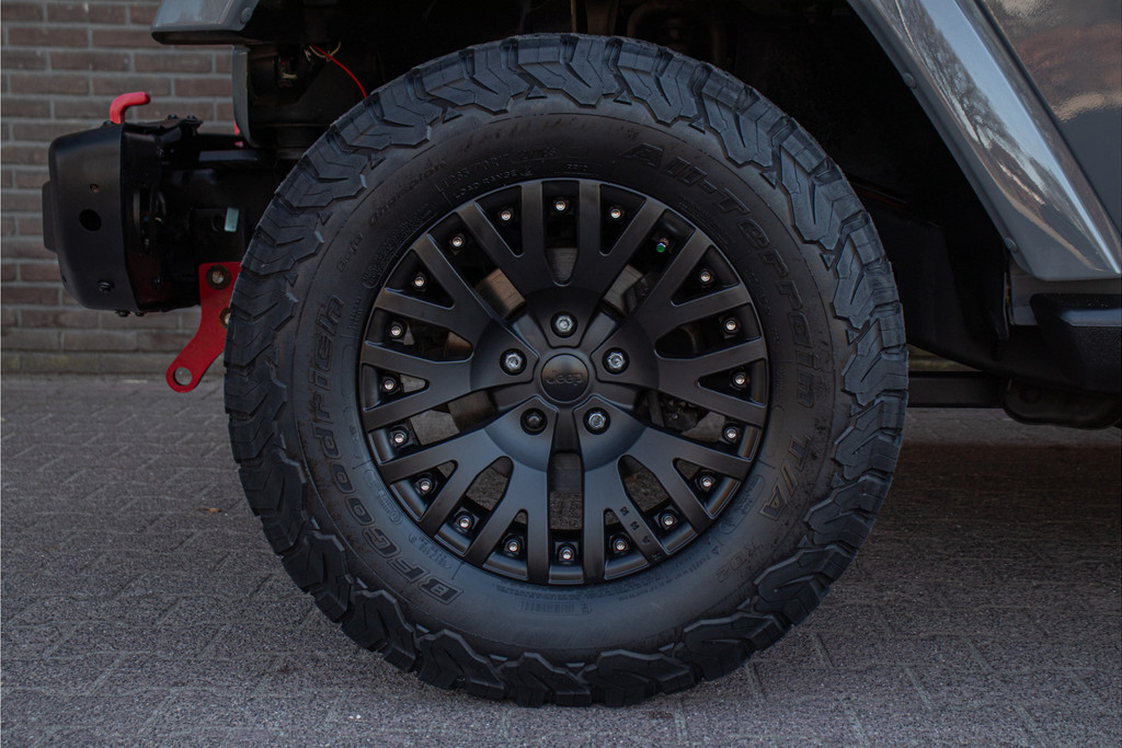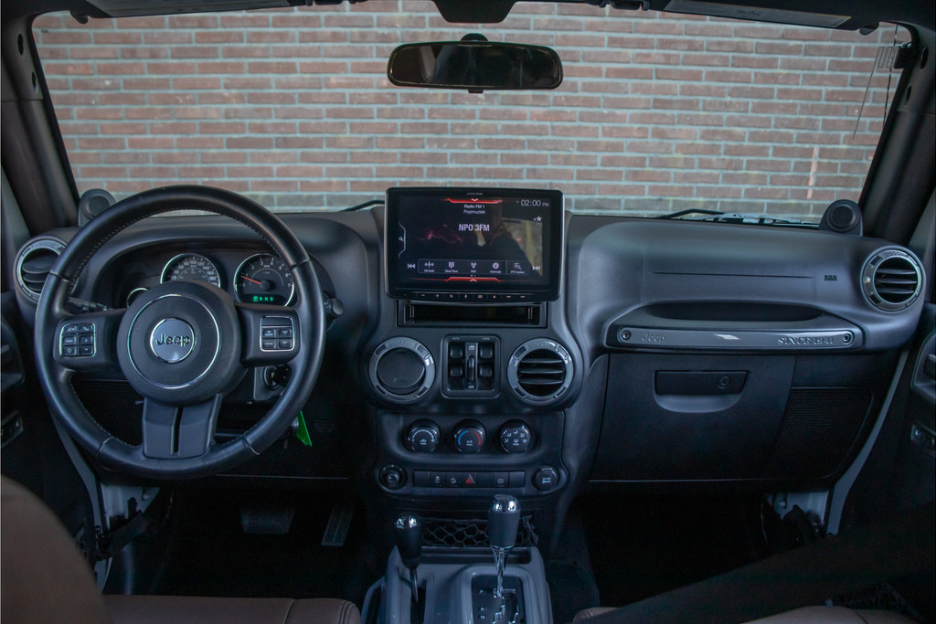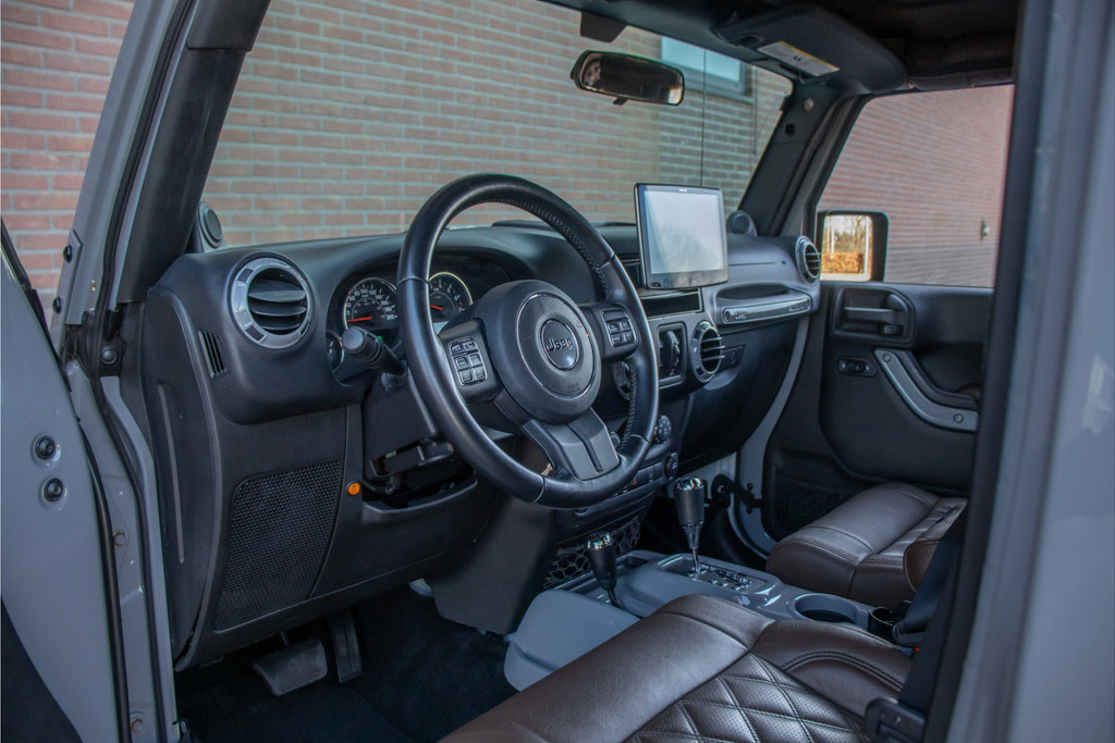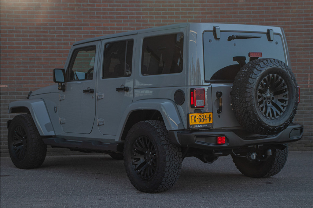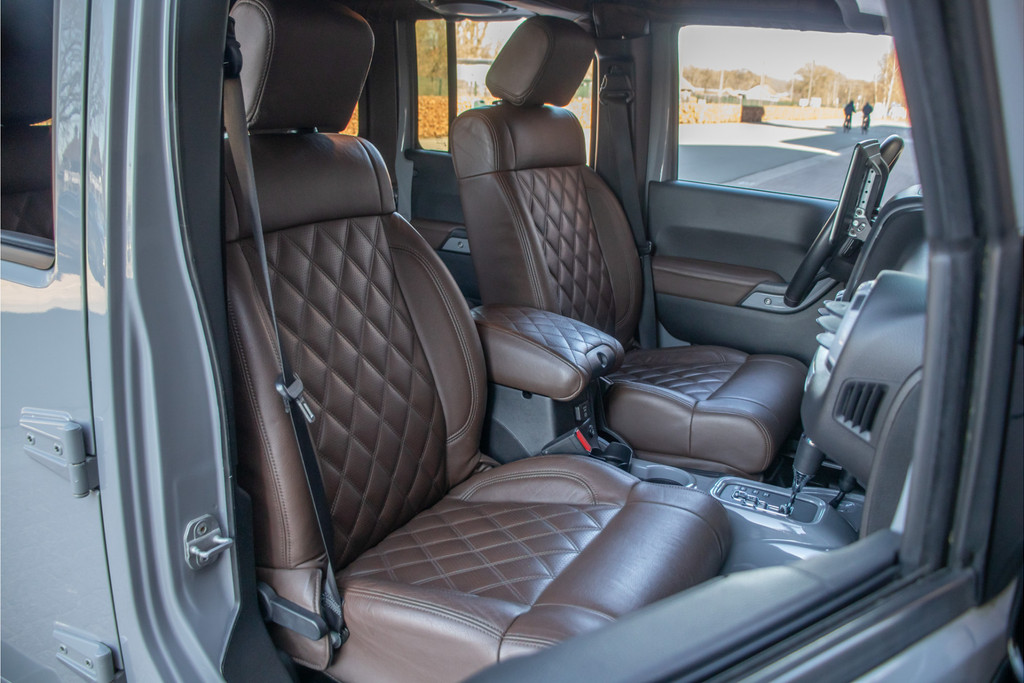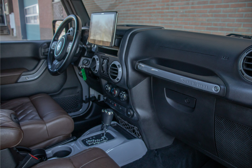 Zo zijn bij deze Unlimited de volgende custom aanpassingen door Brute gedaan: - 'Nardo Grey' speciale kleur (Audi) - Grille, buitenspiegelkappen, handgrepen, logo's en airvents motorkap in hoogglans zwart uitgevoerd - LED verlichting - 17 inch Kahn lichtmetaal - 'Dark Brown' lederen bekleding met diamond stitching - Lederen roll-bar bekleding - Hardtop interieur in 'Dark Brown' gespoten - Namen in hoofdsteunen verwerkt - Luxe mattenset inclusief kofferbakmat Daarnaast is deze Jeep ook nog eens extra voorzien van stoelverwarming vóór, Alpine multimediasysteem met Apple Carplay en DAB+, achteruitrijcamera en een trekhaak.